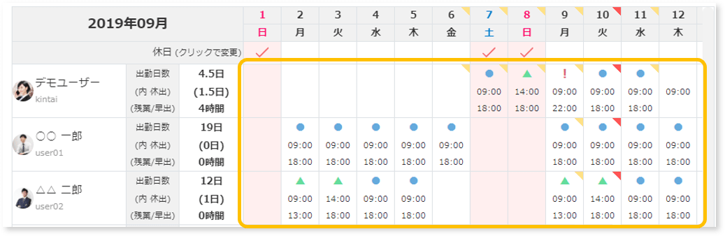 定時時間通りに出退勤が行われた状態です。 |