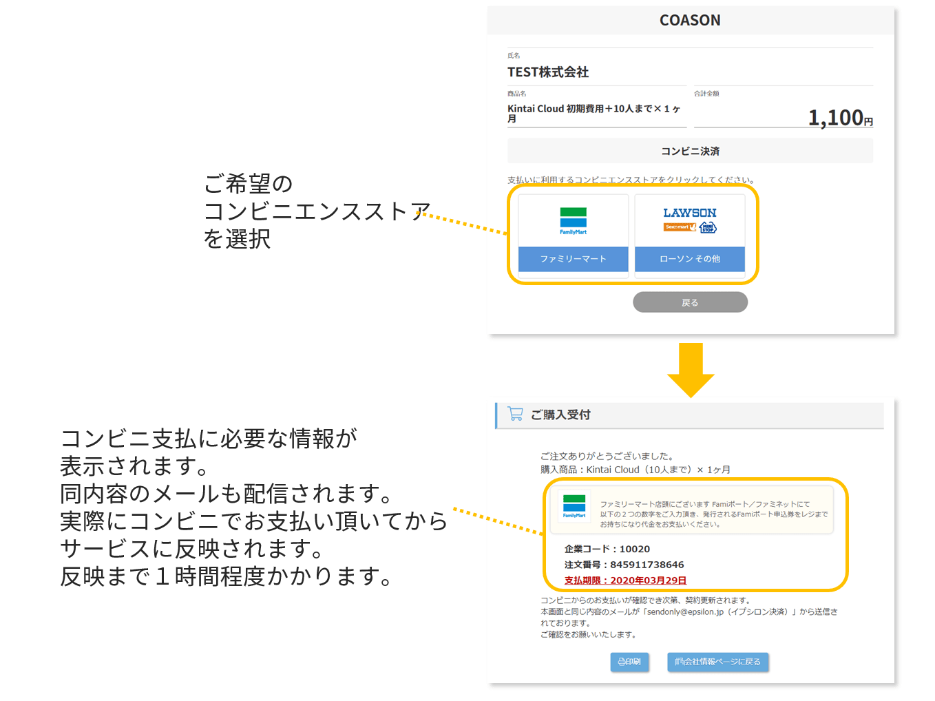 コンビニ決済に関してはイプシロンへお問い合わせください。
