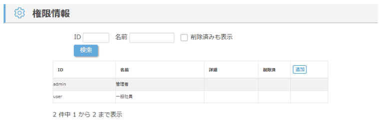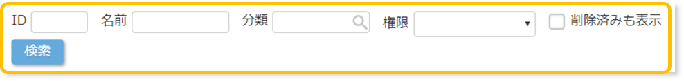 | 権限 | 後述の「権限」にて登録した権限情報から選択出来ます。 ここで選択した権限情報に基づき機能の利用制限がかかります。 |
