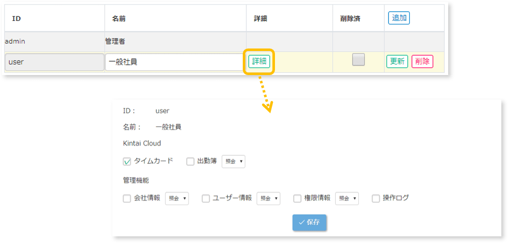 各社員がどの機能を利用できるか管理するための機能です。